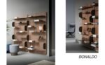 The Blabla collection consists of two different functional units, a bookcase panel and a mirror panel, which when paired together create a system of elements that can be individually positioned or combined in an elegant composition. The distinguishing feature of the Blabla bookcase and mirror is the rounded profile of the shelves and side support panel, as well as the interruption and discontinuity of the shelves. The Blabla collection consists of a thick Canaletto walnut panel, contrasting with slender metal shelves; the bookcase is wall-hung or floor-standing and comes with shelves of various lengths.