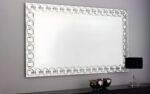 Collection of mirrors model C&Y in extraclear mirror glass 5mm thick with 45° bevel decorated with curly elements in Murano glass, transparent, coloured or in pure gold. Available with hole to install wall lamps and with LED light between mirror and decorations.