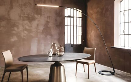 The Lampo table and floor designer lamps complete the living room with simultaneous lightness and flair. Paolo Cattelan developed this modern arc lamp with the intention