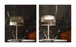 Equatore is a contemporary reinterpretation of the classic lamp with a glass shade. While the traditional abat-jour uses the shade to contain the light source within, in this family of lamps the shade is paradoxically and suggestively empty, with the light being generated by two luminous discs placed inside a central metal band, visible on the shade, that evokes the line of the equator. The light produced by the Leds, thanks to internal screens arranged in layers, is distributed regularly across the surface of the discs, magically illuminating them. The bottom disc directs the light output downward, the upper one illuminates the glass cap for a soft, diffused light. Available in table, floor and ceiling models, in two sizes and two colors: a cooler version in gray with a dark chrome frame, and a warmer version with a transparent dove gray cap and a copper-colored frame.